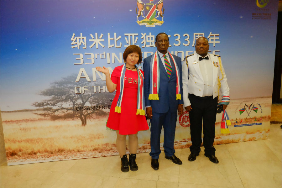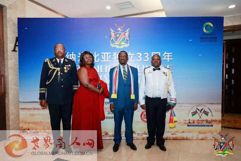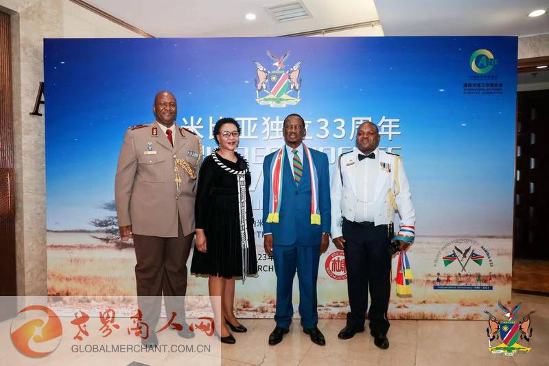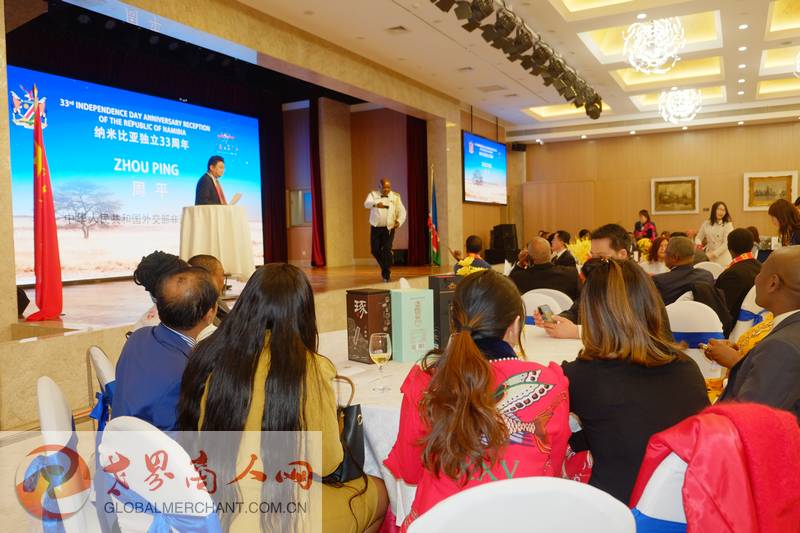 联合国驻华协调员常启德,非洲联盟驻华代表处常驻代表拉赫曼塔拉·奥斯曼,科摩罗驻华大使、塞内加尔驻华大使、卢旺达驻华大使、佛得角驻华大使、南苏丹驻华大使,塞舌尔驻华大使、冈比亚驻华大使、巴勒斯坦驻华大使、圣多美和普林西比驻华大使,加纳驻华大使,马里驻华大使,马拉维驻华大使、索马里驻华大使、喀麦隆驻华大使、坦桑尼亚驻华大使,毛里求斯驻华使馆公使、刚果(金)驻华使馆公使先生,阿里及利亚驻华使馆公使,委内瑞拉驻华使馆公使,俄罗斯驻华使馆科技参赞和各国武官,以及中国企业家代表共两百多人出席此次盛会。环球云链国际旅行社和世界商人网协办了此次纳米比亚第33个独立日庆典招待会。