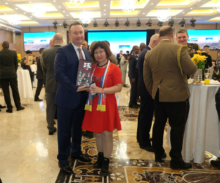 环球云链国际旅行社董事长王晓玲/Marissa女士与俄罗斯驻华使馆科技参赞亚历山大·叶尔莫拉叶夫先生共享纳米比亚独立33周年国庆日招待会指定用酒:北派酱香,承德“琢酒”