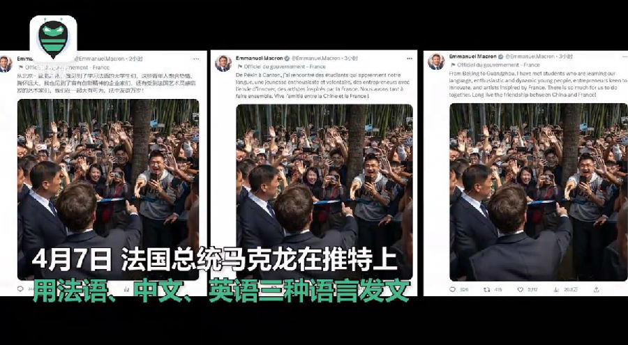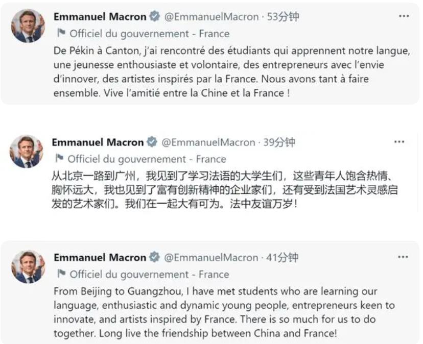 文化丝友 >> 马克龙用三种语言发文:我们在一起大有可为 法中友谊万岁!