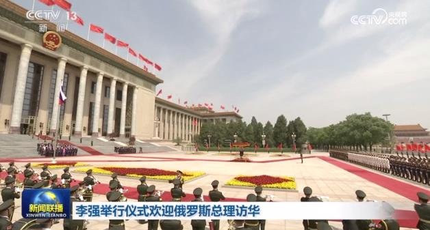 米舒斯京在李强陪同下检阅了中国人民解放军仪仗队。