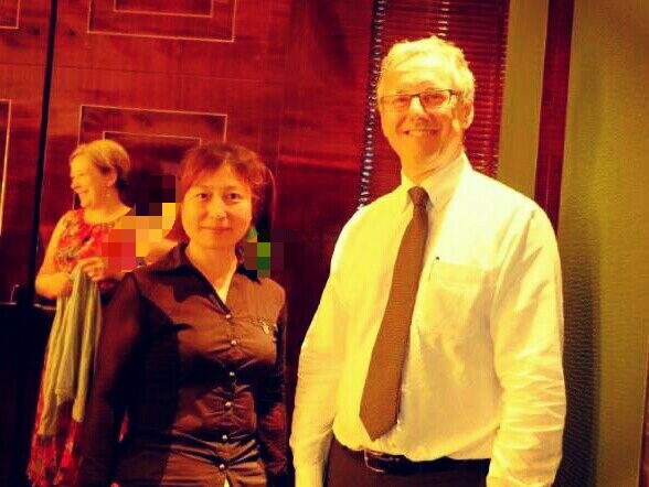 世界商人网董事总经理兼总编王晓玲与英国驻华大使馆公使衔参赞何健中先生会面并愉快合影。何健中先生负责生命科学与社会保障工作